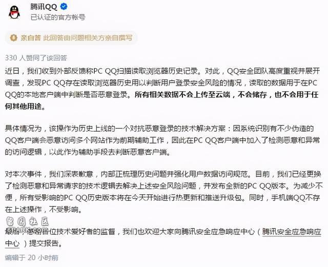 1月18日,腾讯QQ在其知乎官方号上回答该提问时表示,近日,我们收到外部反馈称PC QQ扫描读取浏览器历史记录。对此,QQ安全团队高度重视并展开调查,发现PC QQ存在读取浏览器历史用以判断用户登录安全风险的情况,读取的数据用于在PC QQ的本地客户端中判断是否恶意登录。所有相关数据不会上传至云端,不会储存,也不会用于任何其他用途。