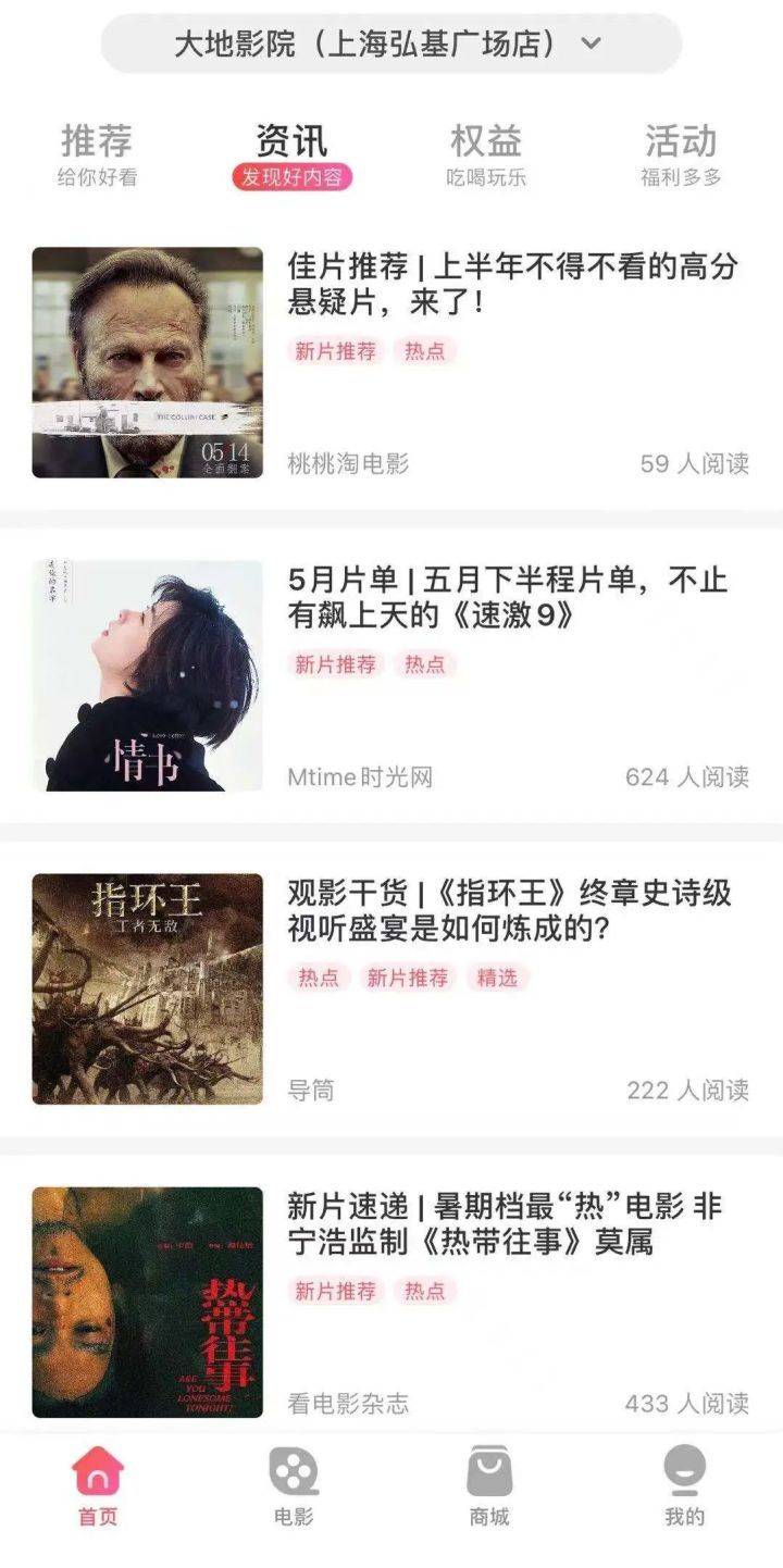 为了提高用户的使用频次,影城自营APP也在增加产品的内容属性。大地影院APP的“资讯”一栏,用户可以看到不同媒体平台发布的电影文章,并撰写评论、参与讨论,通过这样的方式提供信息和社交功能,提高用户对APP的黏性。