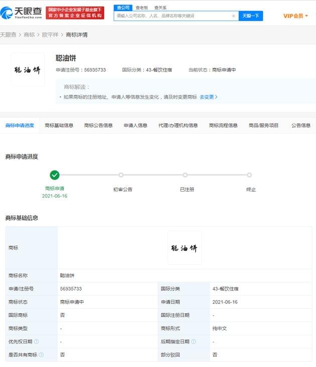 网易娱乐6月23日报道 北京时间6月23日上午消息,天眼查App显示,目前“聪油饼”已于6月16日被温岭市瓜子信息技术咨询有限公司、欧某等申请注册商标,国际分类涉及食品、广告销售、餐饮住宿等,商标状态为商标申请中。
