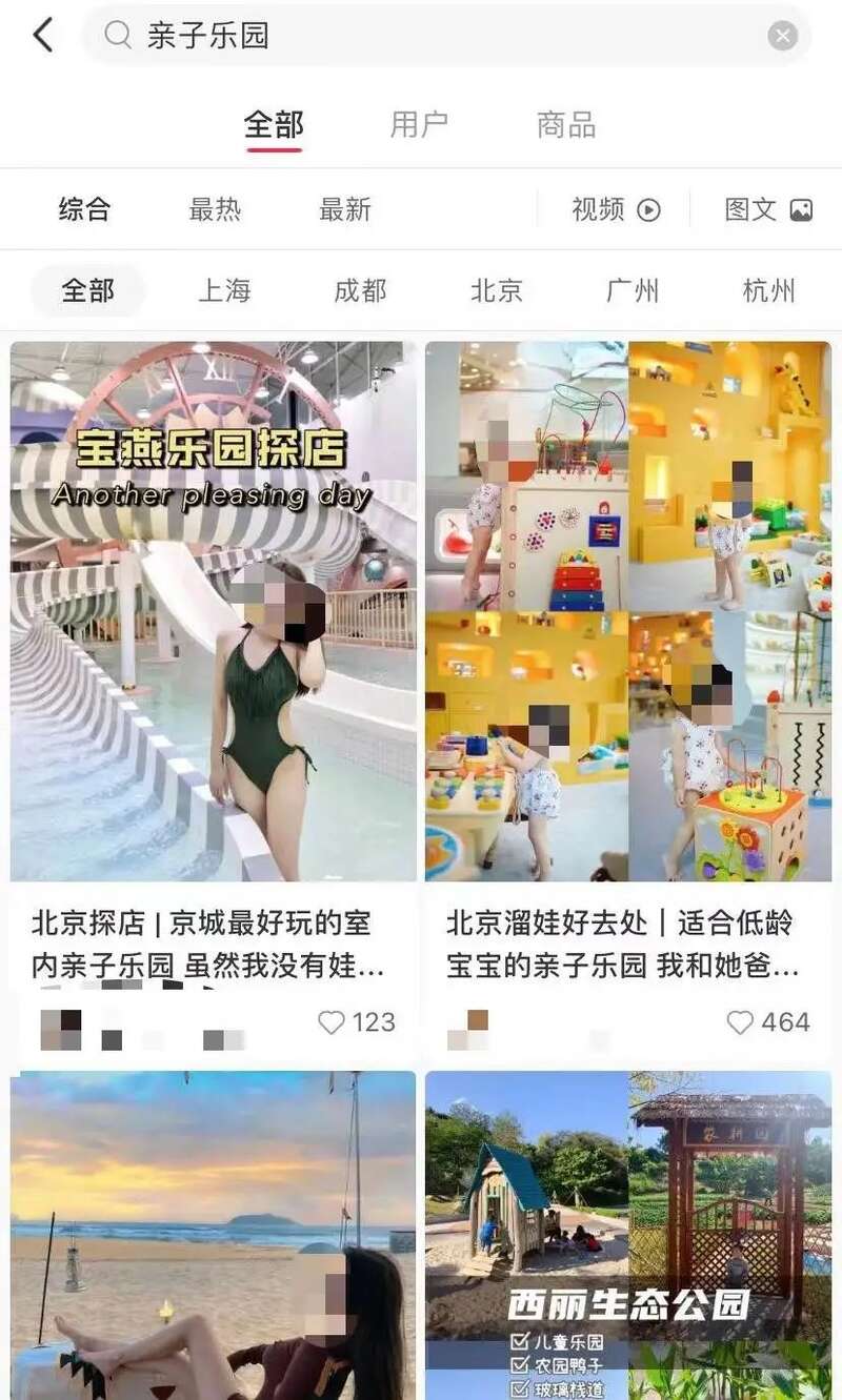 在小红书搜索“亲子乐园”,结果并不都是相关的内容