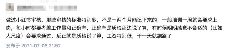 “小红书审核标准特别多,每小时都要考察工作量和正确率”(图源知乎)