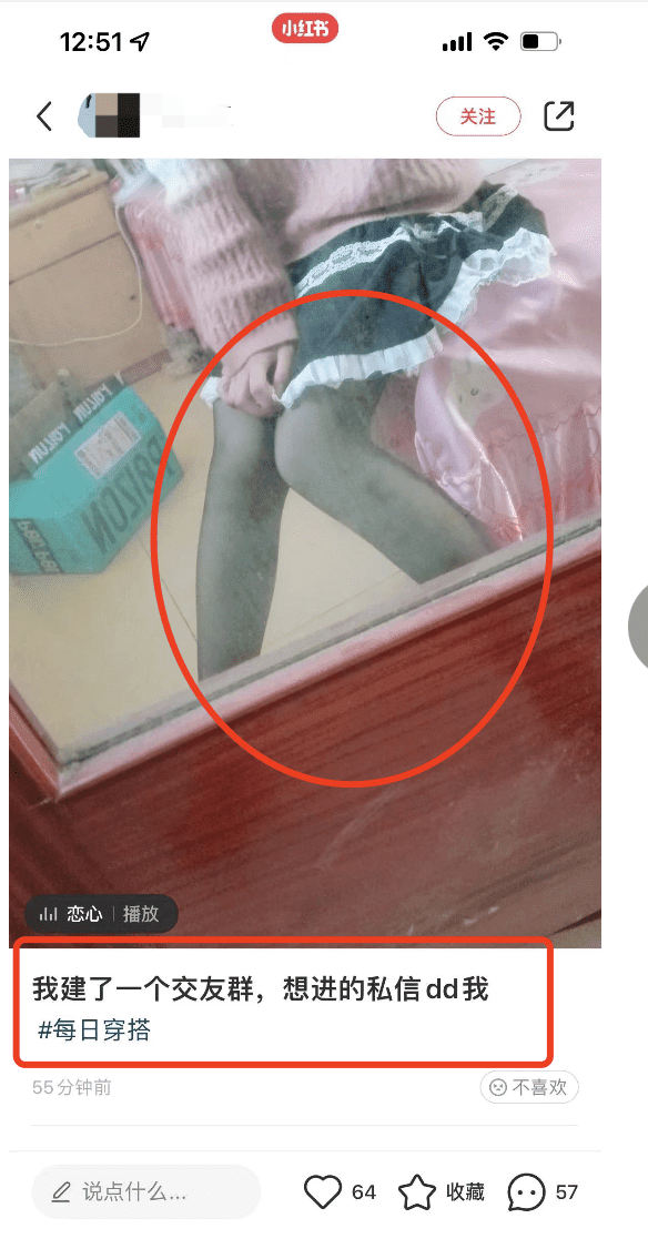 更有甚者,在种草笔记中,发布了黑丝短裙的照片,配文:“想进交友群的私信我。”
