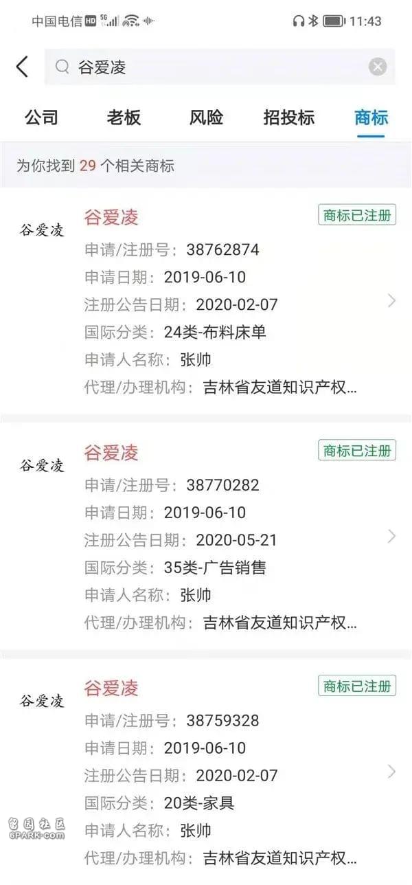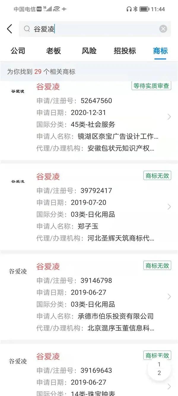 记者通过天眼查查询发现,“谷爱凌”商标申请信息有29条。其中,自然人张某于2019年6月申请的11个“谷爱凌”商标已完成注册,国际分类涉及教育娱乐、广告销售、布料床单等。其他公司及自然人申请的“谷爱凌”商标流程显示为“被驳回”或“商标无效”。