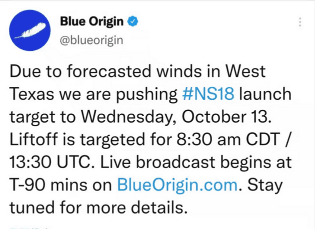 北京时间10月11上午消息,受风向气候影响,贝索斯商业航天火箭发射企业Blue Origin的任务运营团队已决定推迟NS-18 的发射,现在的目标是10月13日星期三。从一号发射场升空目前的目标是美国中部时间上午 8:30 / 周三 13:30 UTC。