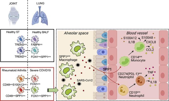 在这项研究中,研究人员在COVID-19重症患者的肺部和类风湿关节炎(RA)患者的关节中发现了一个特定的致病巨噬细胞群(一组专门的细胞)。巨噬细胞是免疫细胞,负责吞噬和消灭病原体和垂死细胞,但当过度激活时,它们会诱发组织中的病变。