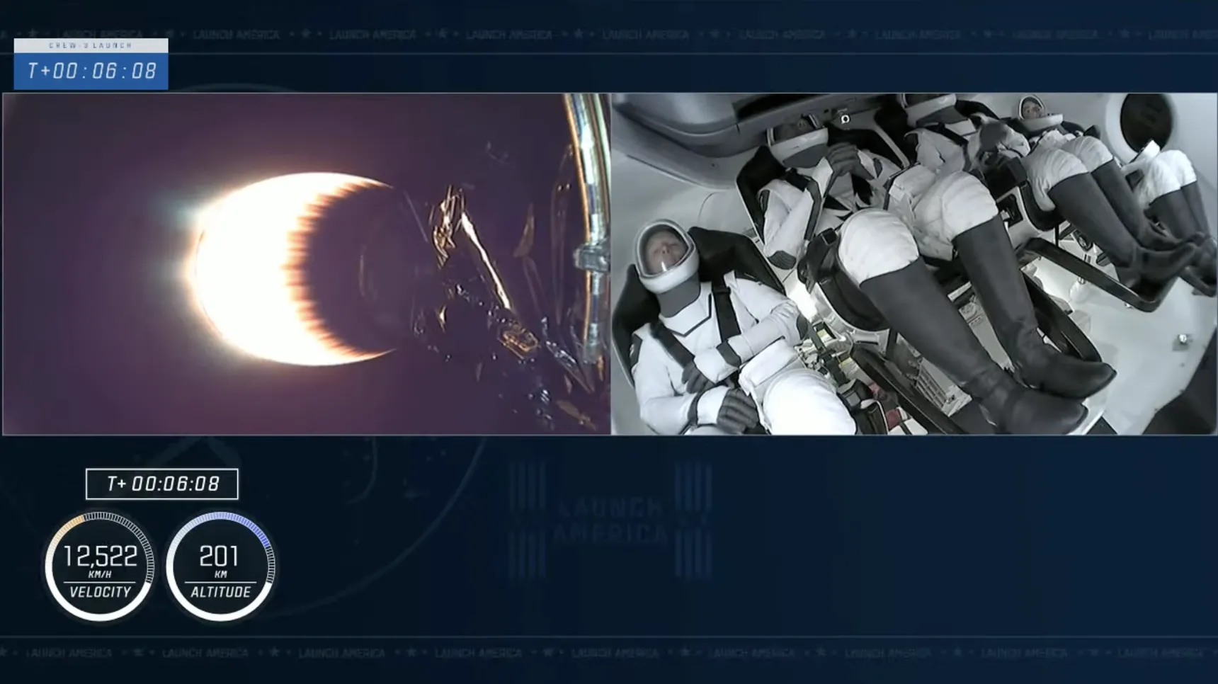 “欢迎进入轨道,”SpaceX任务控制中心在机组人员跟火箭的其他部分分离时对宇航员们说道,“希望你们喜欢从(猎鹰9号)上下来的旅程。载人龙飞船将带你们离开这里。一路平安。”发射主管也向机组人员送去了他的热情祝福--“很高兴能与你们一起参与这项任务。在星空中享受你们的假期。我们会在你们飞过时挥手致意。干杯。”Chari在飞船上回应称,这是“一次伟大的旅程,比我们想象的要好。”