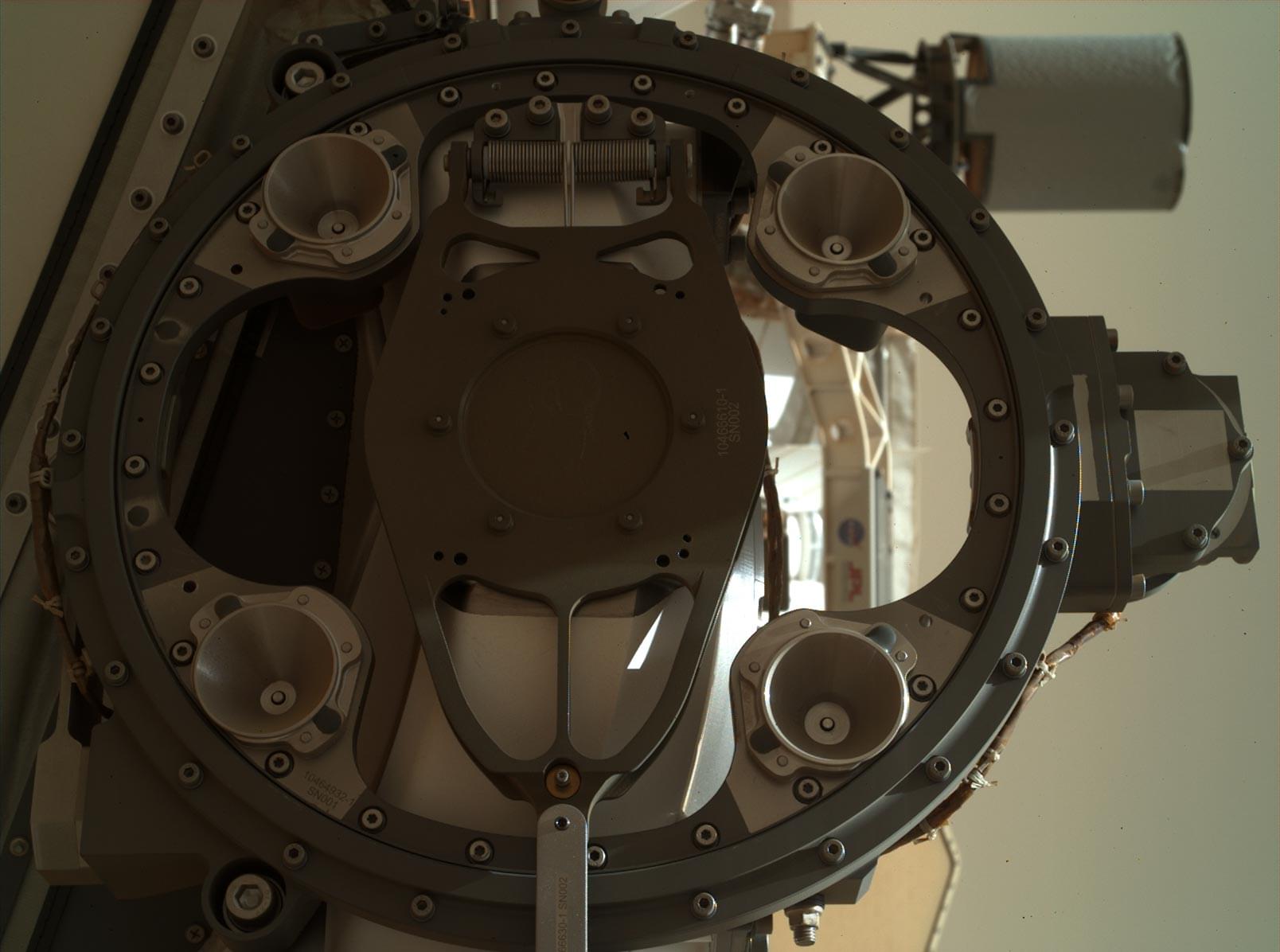 “毅力号”上的WATSON相机拍摄的机器臂图像。在获取这张图片时,位子旋转器前面的一扇门仍然关闭,后来被打开了。