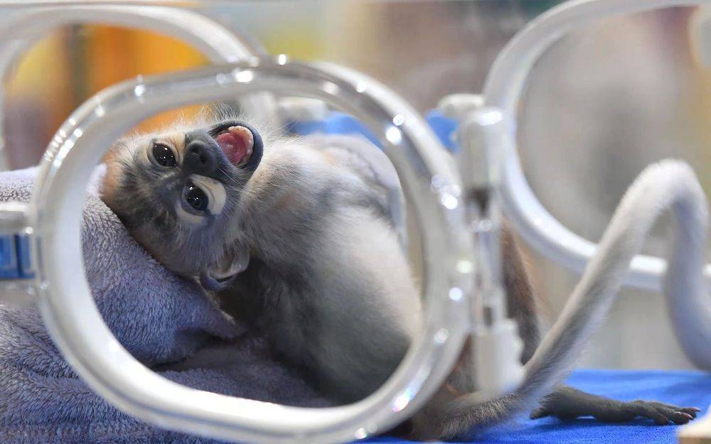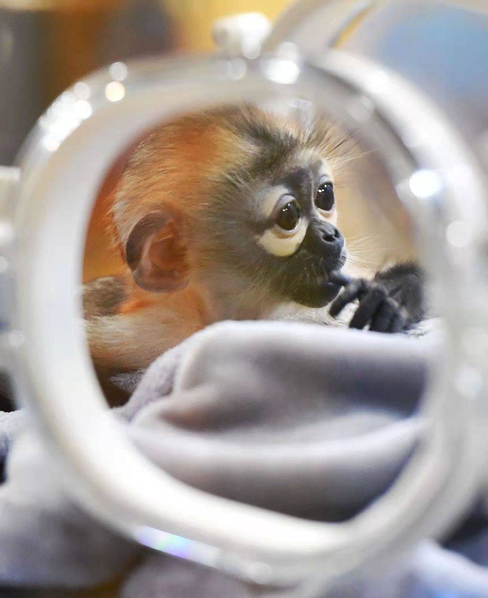 ↑11月10日,人工繁育成功的黑腿白臀叶猴宝宝在广州长隆灵长类研究中心保育箱内。