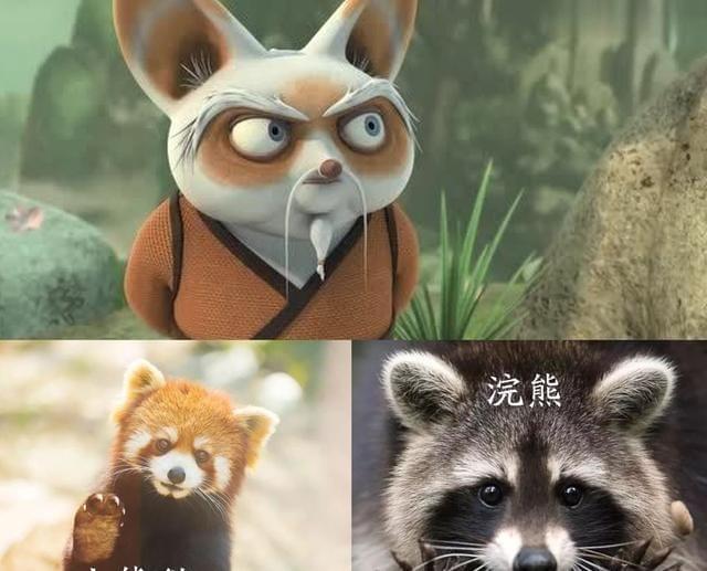 关于师父到底是什么动物,网上争议也很大,有说是浣熊的,也有说是小熊猫的。从耳朵的形状以及眼影来看,还是更像小熊猫,毕竟要跟大熊猫组队,小熊猫比较合适,小浣熊还是去做干脆面吧。