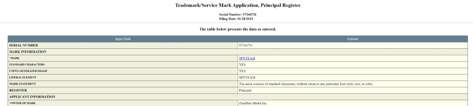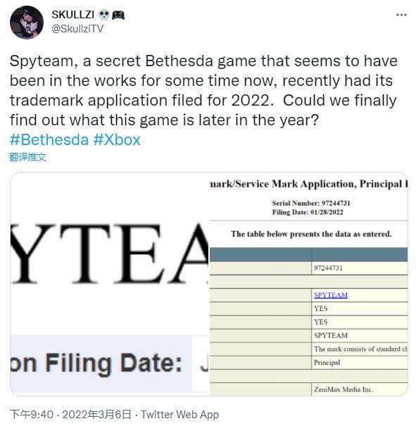 Bethesda已经为“Spyteam”申请了商标,这可能是该发行商的新作品。Bethesda已经为“Spyteam”申请了商标,这可能是该发行商的新作品。据推特用户SkullziTV发现,ZenniMax于2022年1月28日提交了这一申请,不过这是之前商标的延伸,而不是新商标。