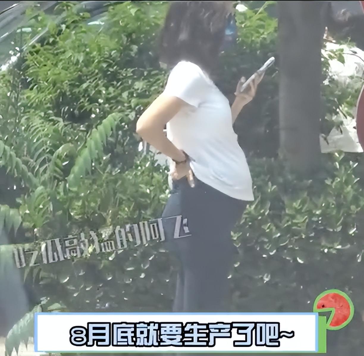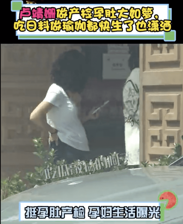 卢靖姗穿着白色T恤搭配舒适的健美裤,孕晚期的她孕肚高高隆起。卢靖姗一只手拿着手机,一只手扶着自己的腰孕相十足,随行的还有一位助理。