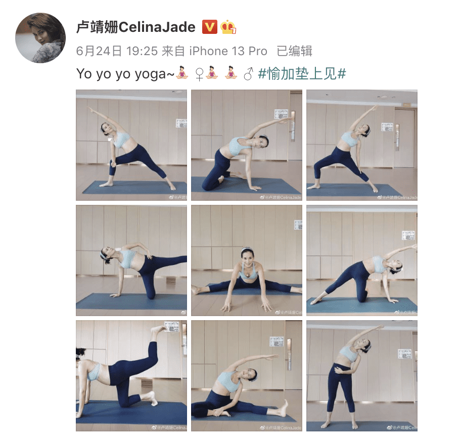 卢靖姗在家里安心养胎,但也没有完全闲着,她多次分享了自己练习瑜伽的照片。