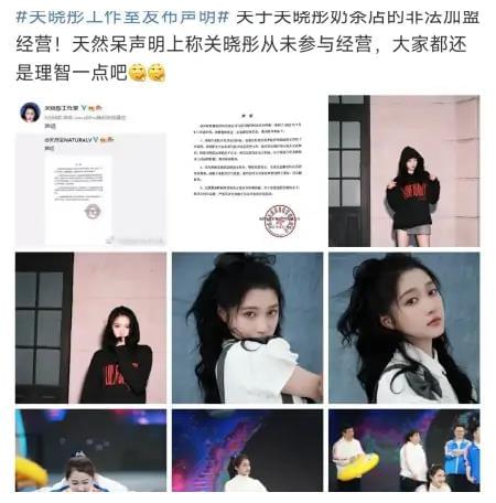 3、关晓彤口碑彻底崩盘了?因为那些乱七八糟代言的事情,关晓彤的路人缘已经彻底崩盘了。她前两天特别高调的起诉某化妆品公司侵犯她的肖像权,想要靠着这件事转移一下大家的视线,跟奶茶店彻底解绑。但是基于她代言已经出过太多岔子了,在舆论这块她根本不占好,反而又把代言翻车的事情给推到风口浪尖上了。至于那个奶茶店,就像声明里面说的,关晓彤女士确实是没有参与经营,但是她可没少给品牌做宣传啊,甚至还在线下以店长的身份去做过很多次推广活动。
