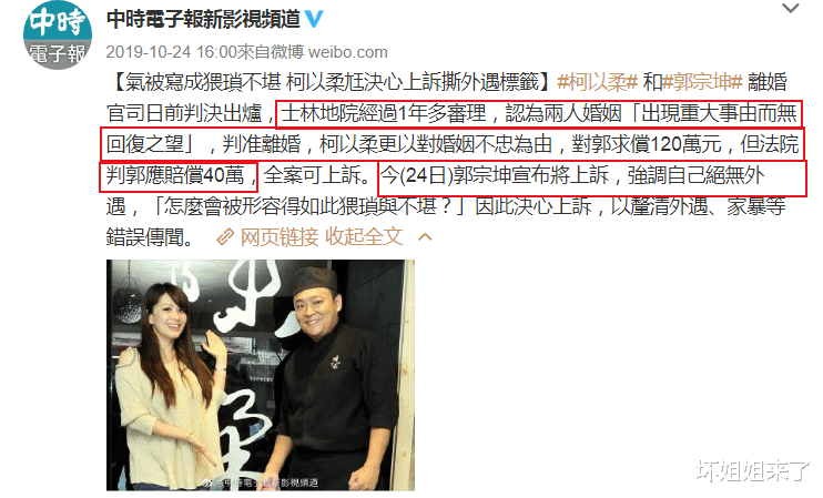 并且,法院认定郭宗坤在婚姻中有过失,须赔偿女方40万台币。