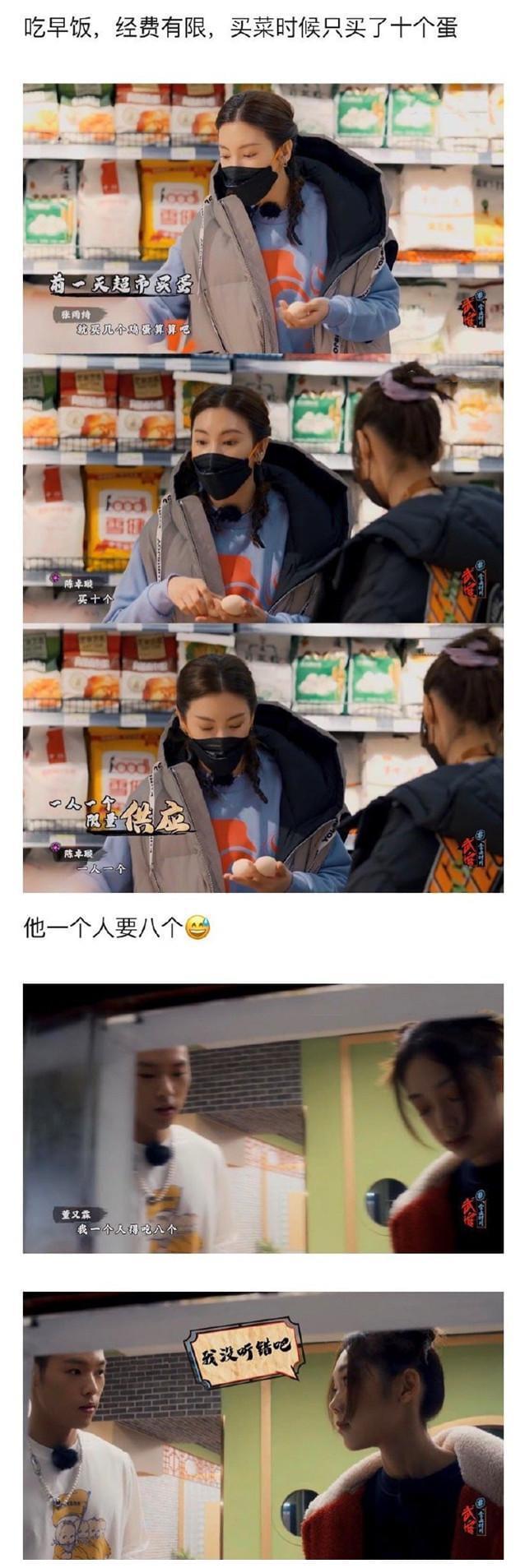 前不久他和硬糖少女303一起录制节目,因为每天的经费有限,所以买鸡蛋时大家说买十个,一人吃一个。结果在别人做早餐时他却说自己要吃八个