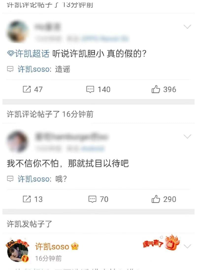 于是粉丝们纷纷在线担心,喊话许凯要勇敢!结果没想到正主还下场反怼,表示粉丝们在造谣:“不要造谣!谁害怕?谁?”