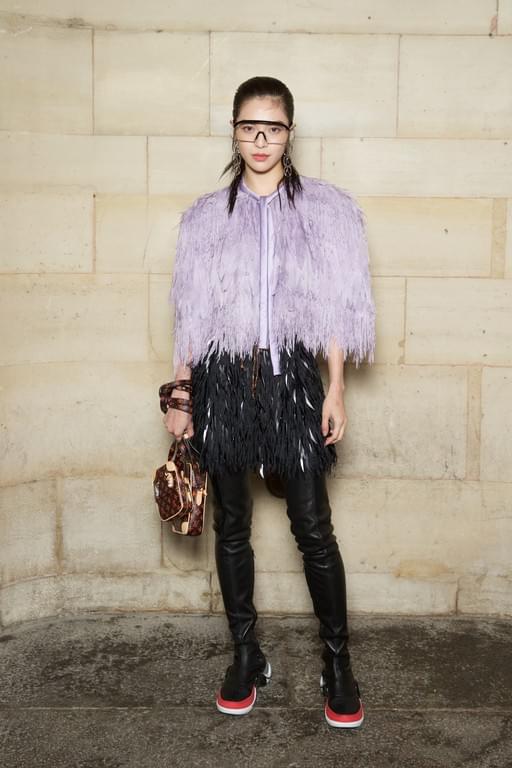 她这身造型,LV的爱将裴斗娜在今年巴黎LV2019春夏时装周上就有穿,她当时也是发型清汤挂面,妆容清淡,但是腰板挺直,彩色羽毛亮片上衣与黑色过膝长靴,确实也不需要太多色彩。