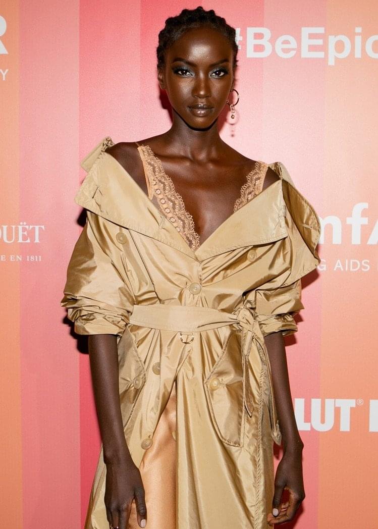 名模Anok Yai参加巴黎amfAR艾滋病研究基金慈善晚会——这个级别应该可以和时尚芭莎慈善晚会一致,她也选择了同款金色丝绸大衣,不过是在里面加了件蕾丝内衣,正式庄重又充满巧思。