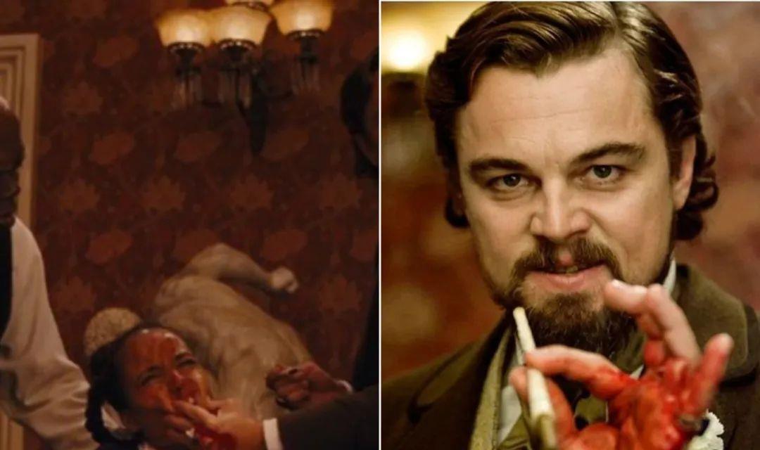 《被解救的姜戈》:在这个场景中,小李子用手猛拍桌子的时候拍到了一个玻璃杯,手上鲜血直流,但是导演没有喊卡,小李子就这么一直演了下去,甚至还把血涂在了女黑奴的脸上…拍摄结束后,房间里所有人起立,并爆发出一阵鼓掌声。