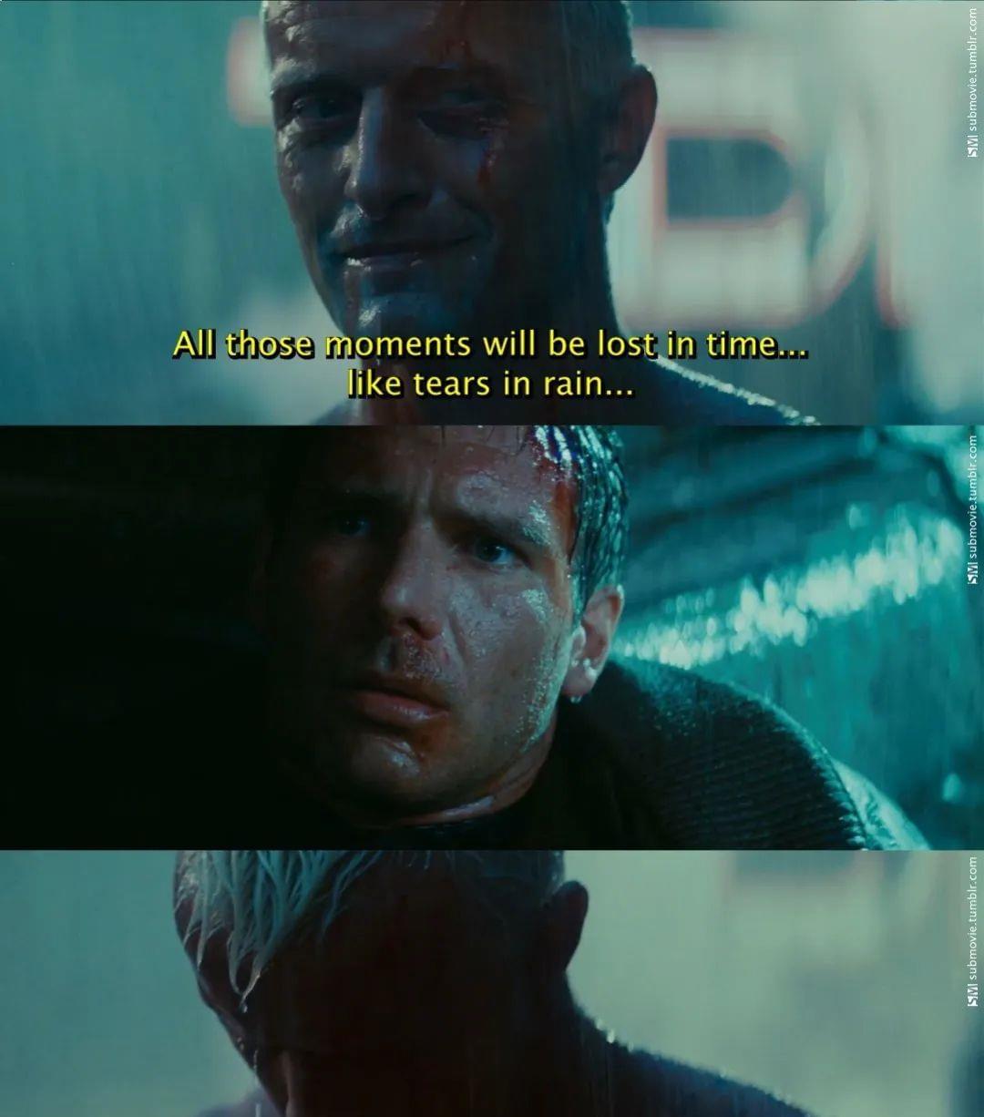 《银翼杀手》:说到即兴表演,当然不得不提银翼杀手中,罗伊在死前这段“雨中泪”的独白了,其实这段台词大部分都是演员鲁特格尔·哈尔即兴创作,在拍摄现场表演该段对话时,电影工作人员集体鼓掌,有些人甚至当场哭了。