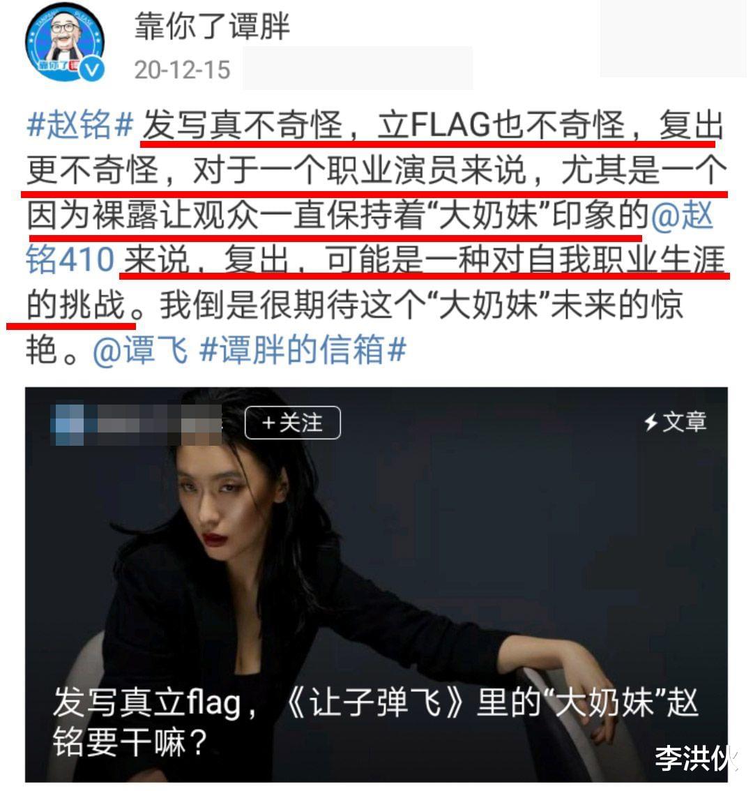其中监制谭飞老师站台,为赵铭发声,对于一个职业演员来说,复出并不奇怪,尤其是一个因为裸照让观众一直保持着“大奶妹”印象的赵铭来说,复出,可能是对自我职业生涯的挑战。而对于赵铭自己来说,她踏实做事,坦坦荡荡,没有任何问题。