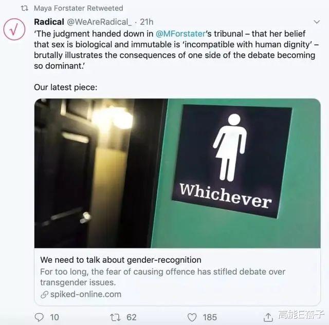 然后有位名叫玛雅的英国女性极力反对这项政策,认为这会侵犯女性的性别空间,理由是她难以想象跨性别女性进入女厕所、浴室的场景,结果她因此丢了工作。