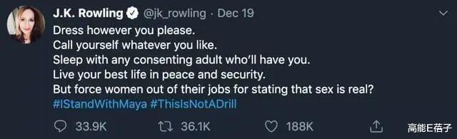 JK·罗琳为此公开为玛雅打抱不平,写道“女性只因为坚持生理性别是真实存在的就要被开除吗?”并在推文上加上“我支持玛雅”的标签。