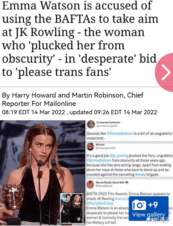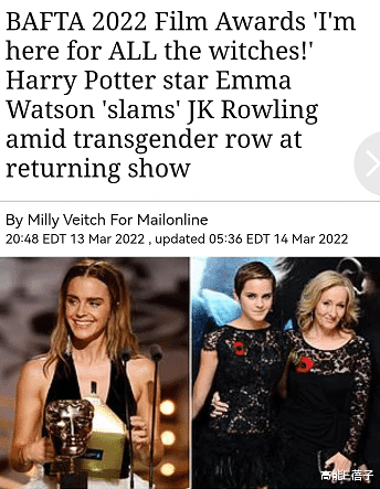 因为艾玛反对和内涵JK罗琳也不是一天两天了。今年三月她在出席英国电影学院奖颁奖典礼时,被主持人这样介绍出场“她自称是一个女权主义者,但我们都知道她是个女巫”。