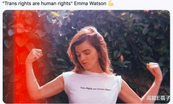 她先是晒了一张自己穿着跨性别T恤的照片,并配文“跨性别者的权利就是人权”。这张图也是众多“哈迷”用作反对JK罗琳、支持跨性别者的图片。
