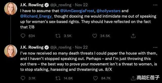 气得在跨性别舆论战被迫远离推特的JK罗琳重回网络,一连八条推特捍卫自己的权利。