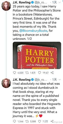 昨天罗琳还在自己的推特上怀念《哈利波特》,说“就在二十五年前的今天,我第一次在一家书店看到了《哈利波特与魔法石》。那是我一生中最美好的时刻。”