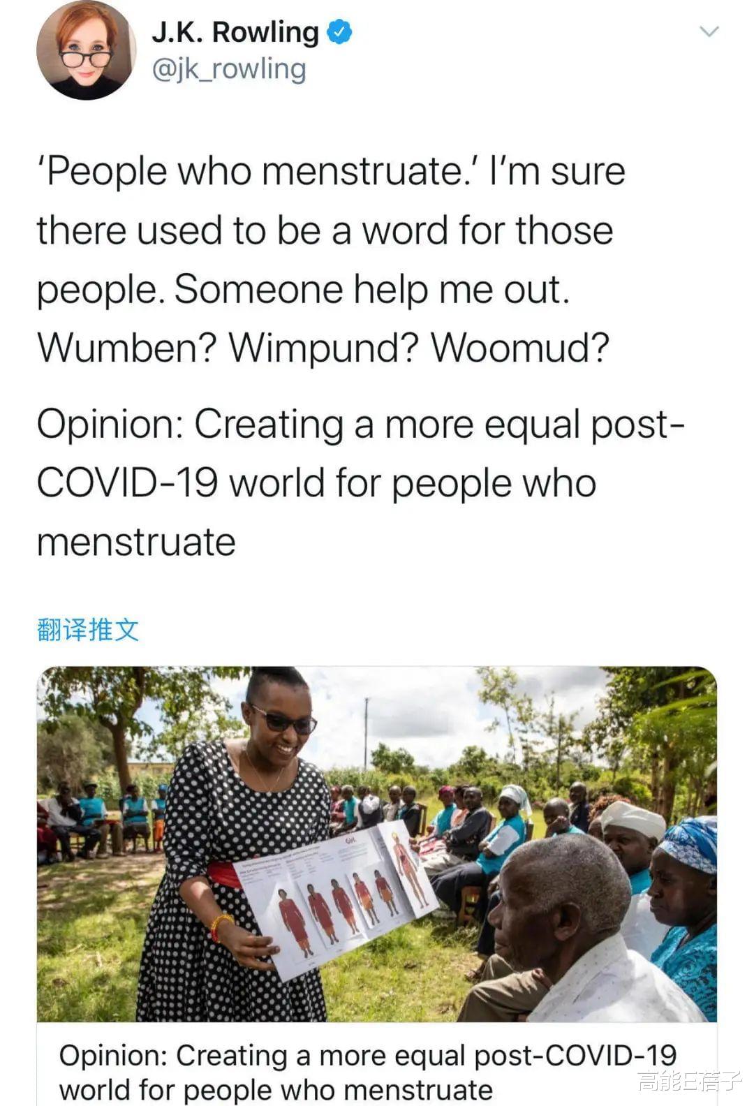 但这也没有阻挡JK罗琳继续发声,2020年6月她转发了一条题为“为来月经的人创造一个更平等的后疫情世界”的推特,并评论到“‘来月经的人’,我肯定过去有一个词是形容这样的人的,有人能帮我说出来吗,是女楞?女能?还是鲁能?”