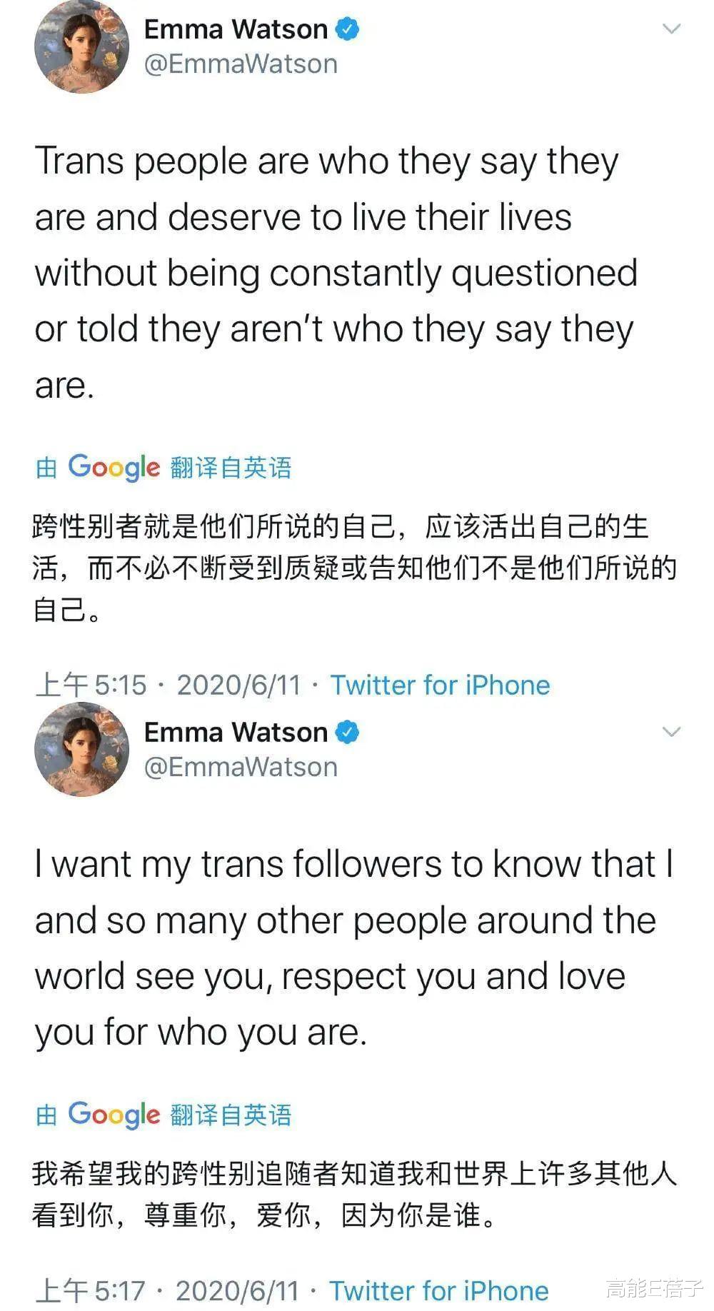 随后还连发数条推文,表示自己对跨性别者的爱与支持。