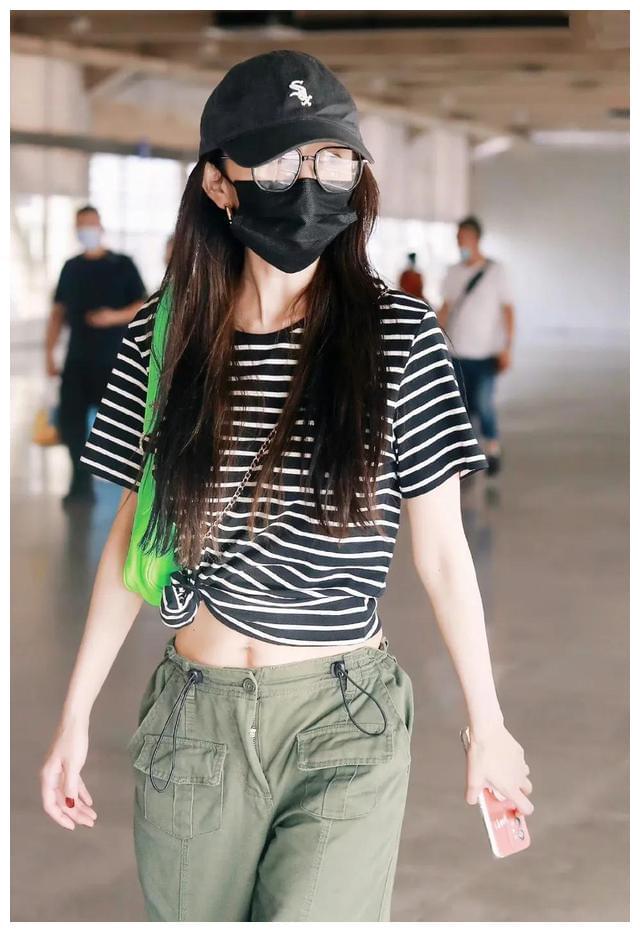 大幂幂穿着黑白条纹短袖,加上绿色工装裤,搭配黑色鸭舌帽,特别酷飒。露出的小蛮腰,更是一绝。
