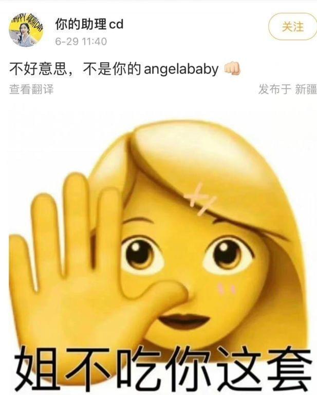 热狗还没回应,baby的助理这边发声了,直言不好意思,不是你的angelababy,还配上了一个拳头的表情,意思自然不言而喻了。