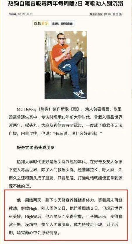成名后的热狗还将吸D史写进了歌里,甚至得到了粉丝的追捧,这样的艺人还能够活跃在大众面前,娱乐圈真是宽容。