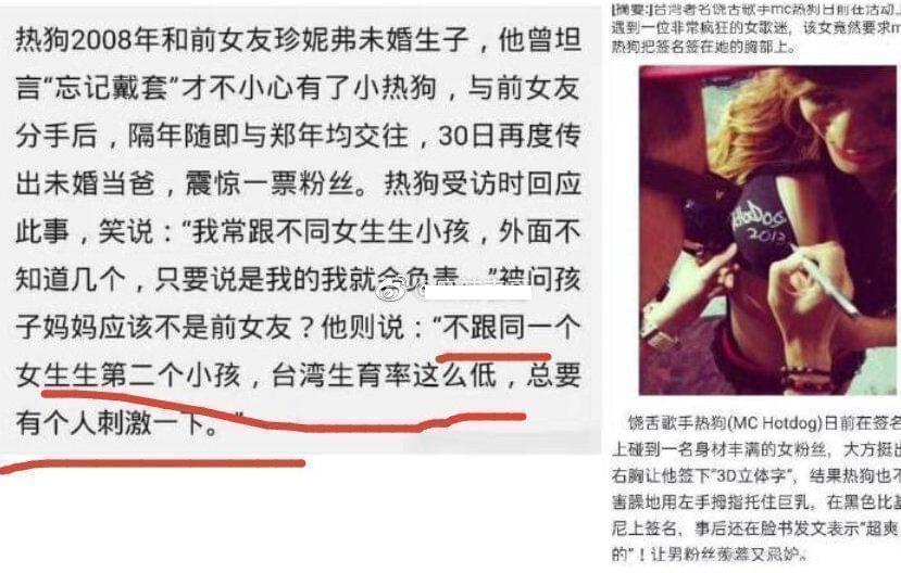 热狗曾和外籍女友未婚生子,他非常淡然提到,自己忘记戴T了,才有了小热狗。与前女友分手后,热狗立马和另外一名女生恋爱,又导致对方怀孕,热狗表示,他希望和不同女人生小孩,并调侃每个女生的感觉不同。