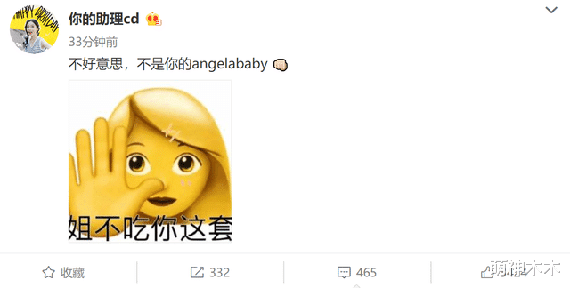 近日,嘻哈歌手热狗发布新歌,其中一句歌词“你是我的Angelababy,还是卑鄙”引发网友热议。随后,baby的助理进行了回应:“不好意思,不是你的angelababy。”还配上了“姐不吃你这套”的表情包,态度非常刚了。