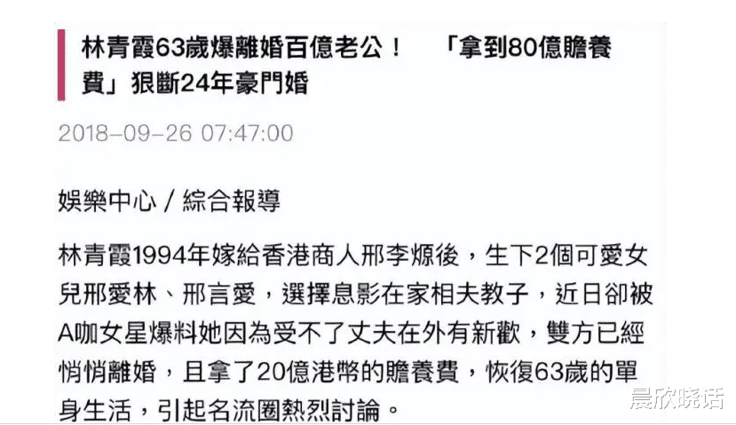 2018年,有台媒爆料林青霞和邢李原已经离婚,林青霞个人分到20亿港币的赡养费。