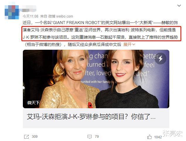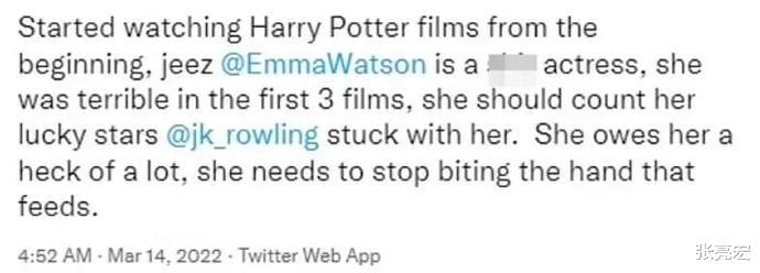 网友原话:“从一开始看《哈利波特》电影时,就觉得艾玛在前三部电影里演得很烂!她应该把罗琳看作自己的幸运星才对,她欠了人家那么多,可不能像这样恩将仇报啊!”