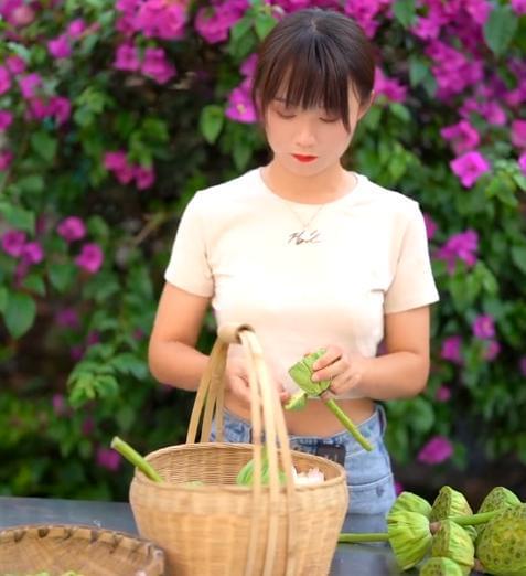 视频中,严素来到一处池塘。夏日炎炎,池塘里密密麻麻盛开着莲花,莲叶错落交叠,连池面的看不到,严素这次要做的菜肴正是跟莲子有关。