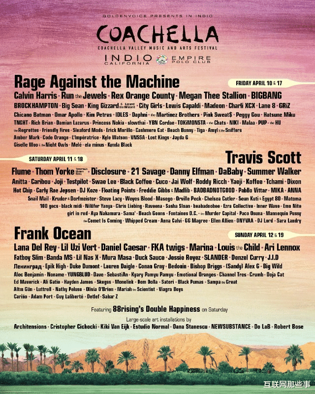 由于Coachella跨越了全球,几乎半个欧美娱乐圈都会去,为了分流,Coachella音乐节分为Week1和Week2,两周的阵容是完全相同,价格也相同。