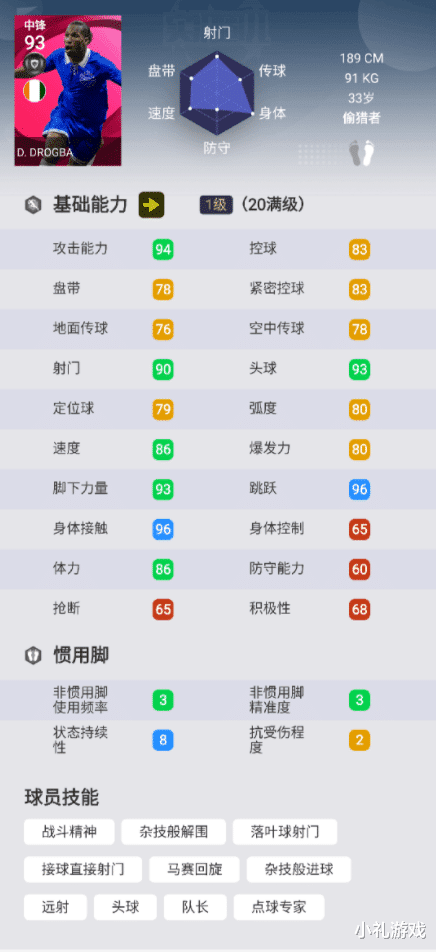 通过一些简明的颜色,我们不难看出,这位“非洲刘德华”绝对会是位凶悍的球门杀手,90的射门值可以说是指哪到哪,189cm的“高塔”身躯,96的跳跃,再糅合93的头球值,只要往对方禁区一站,那片小天地就完全由他主宰!而完美的状态持续性,又是游戏官方对德罗巴本人职业态度的一种最好认可,只要坚持,他就一定能够为你带来胜利!