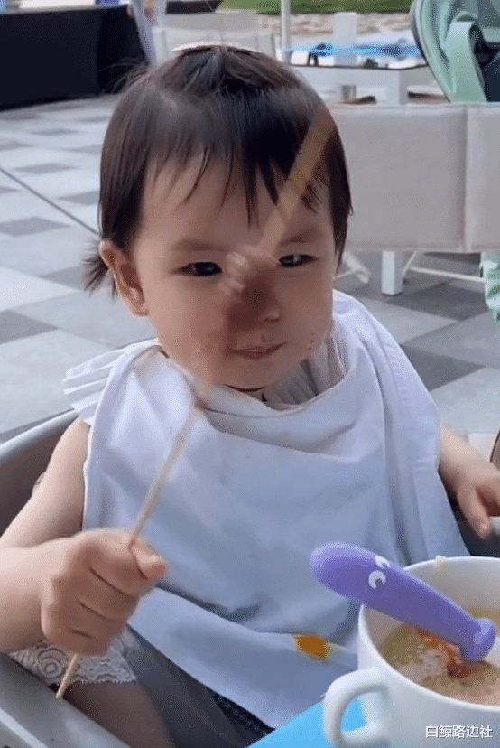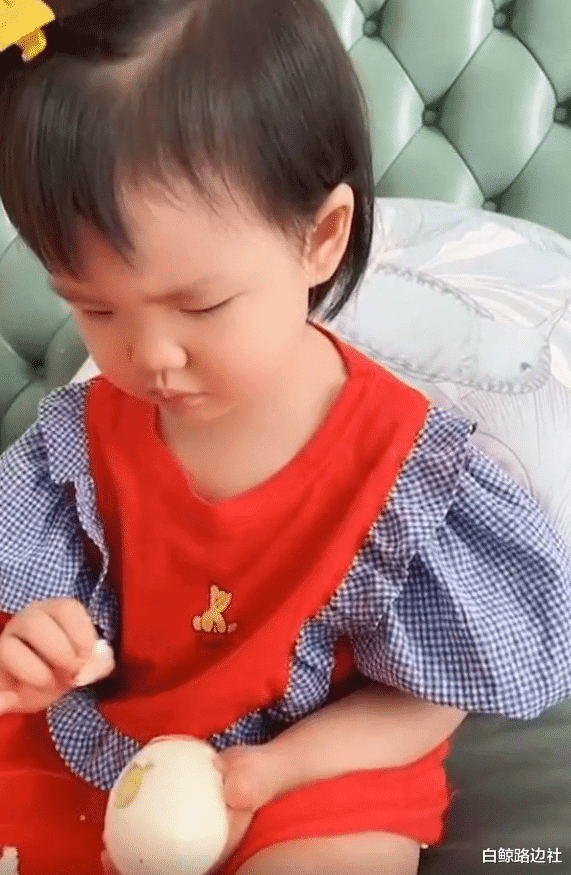 和大栗相比,3岁的姐姐桔子则要安静乖巧许多,一个人坐在餐桌旁静静地剥鸡蛋,或者是带着围嘴吃烤肉,嘴巴周围沾了不少调料,吃相非常豪迈。