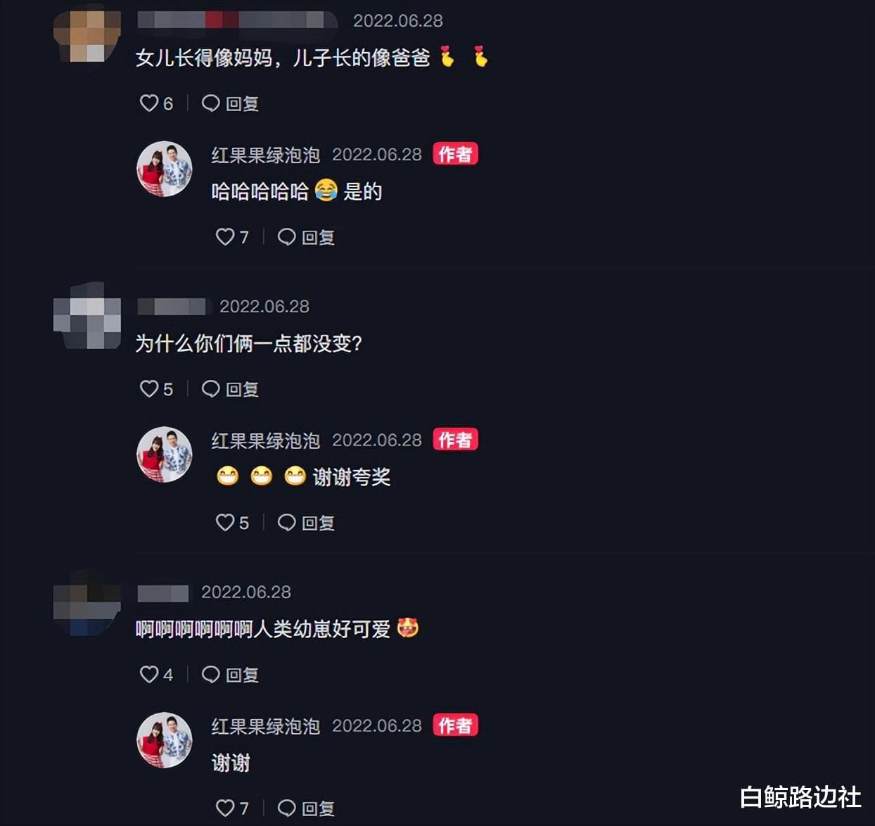 动态公布后,不少网友夸赞桔子和大栗弟弟好可爱,果然人类幼崽就是最呆萌的,两人一个像妈妈一个像爸爸,一家四口都是高颜值。还有人感慨,怎么红果果和绿泡泡好像一直不会老,多少年了仍旧长这样,对此红果果开心回复“谢谢夸奖”。