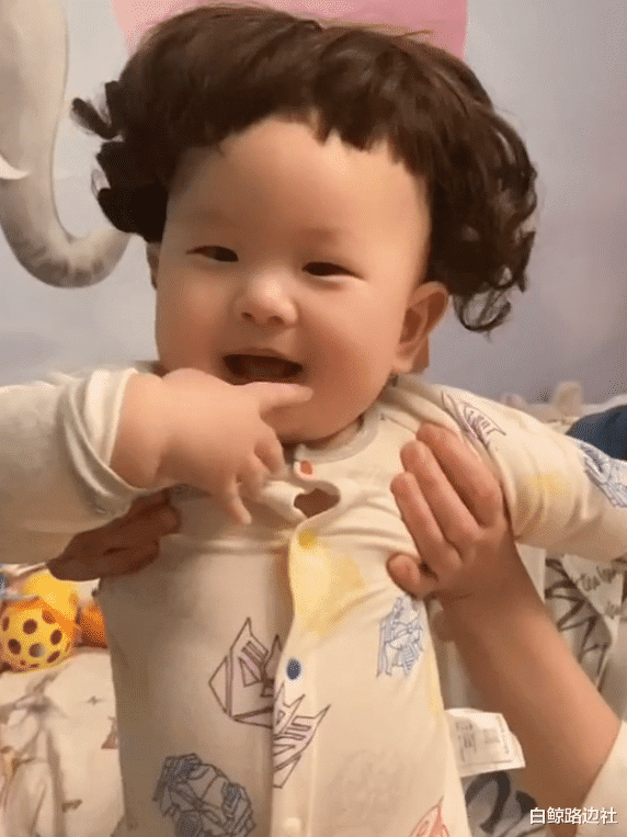 和大多数年轻的父母一样,红果果和绿泡泡也会“折腾”孩子,给他戴了一顶浮夸的假发,大栗的五官长相酷似爸爸,简直就是缩小版的绿泡泡,看起来特别可爱。