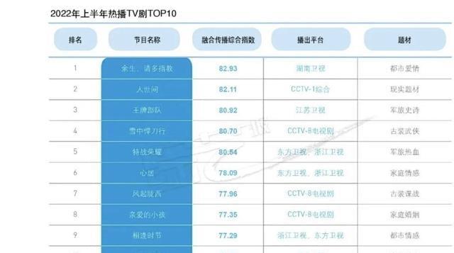 根据美兰德大数据公布的上半年热播剧相关指数,湖南卫视都市爱情剧《余生请多指教》第一,央视1套年代大剧《人世间》和江苏卫视军旅史诗剧《王牌部队》分别位于二三。