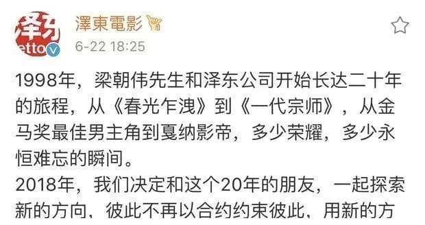 电影荧屏中的“周慕云”也许能能够定格20年,但是作为演员,就算是梁朝伟,也总有老了的那一天。年轻时的梁朝伟,戏路还是很广的,直到他遇到了王家卫。王家卫拍摄的文艺片,给了梁朝伟极大的发挥空间,这对当时的梁朝伟来说,简直是打开了新世界的大门,他也找到了自己的定位。就这样,这对“黄金搭档”一合作就是20年。直到2018年,梁朝伟与王家卫的电影公司解约。