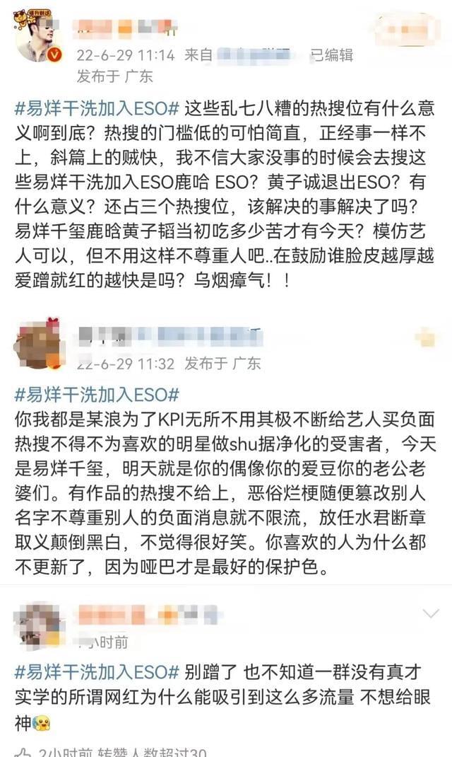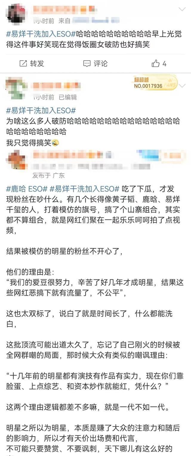 在各种社交平台上,都经常能见到模仿千玺的人,有的人眼睛长得像千玺,有的人在声音上可以模仿千玺,无论是哪一种,都能赢得无数的追捧,换来大量的流量。这些模仿并不算过分,网友们也不厌烦。但一个名为#易烊干洗加入ESO#的tag登上热搜,让小编无法接受。