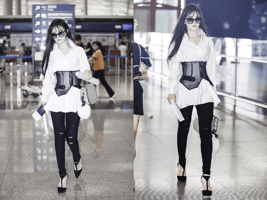 中长款的白色衬衫,本身就能形成衬衫裙的穿着,在腰间搭配一件黑色腰封,将宽松的衬衫束起来,塑造出小蛮腰,搭配黑色紧身破洞铅笔裤,太时髦。